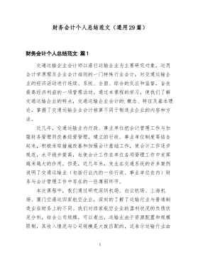 2025公司会计年终总结(通用22篇)2025公司会计年终总结篇1您们好!转眼间我来北京信汇精细化学品事业部财务处从事成本会计工作已经一年了。虽然时间不是很长,但在这一年里,我确实学到了许多在学校里学不到的东西。现将我一年来的工作、学习情况汇报如下:刚来到事业部时,由于与原会计人员交接工作只有十天,之前也没有接受任何的培训,作为一个会计新手,面对工作,的确总无措。但我很快就冷静下来,理出自己的工作思路。我参阅了以前年度的会计凭证及一些成本资料,熟悉成本会计的职责范围。一、收集材料入库单,调拨单,与仓库保管员,物流部统计员接口,做好协调沟通工作,以使总账与仓存一致。二、确定并熟悉工厂的成本核算方法,原材料核算为月末一次加权平均法,产品成本核算方法为品种法,从原材料采购生产领料生产产品到产品入库,清楚整个成本核算的流程。三、建立了材料明细账,确定产成品分类。四、整理各项费用并进行归集和分配,接收各业务部门转交的发票及单据,审核是否正规规范,及时入账,月末对费用进行分配核算,统计各项费用的指标并上报经理。1五、负责工厂的固定资产账目。做好新购固定资产的登记入账,负责每月计提折旧并做好固定资产的报废、清理的账务处理。六、月底与应付账款会计、应收账款会计、仓库保管员、统计员协调沟通,做出月末存货盘点表,盘点仓库原材料,产成品,达到账账相符,账实相符。七、月底与各相关人员沟通,在原材料,产成品收发截止的情况下,进行产成品成本核算。产品成本核算是一个系统复杂的过程,也是工作中很容易出现问题的地方,例如有时候计算的原材料单价不正常,可能就是有些材料采购入库但未记账,产成品核算后有些产品月末结存数量为零但金额不为零,可能就是销售出库红冲单据存在问题。但无论出现什么问题,经过一番努力,问题终能解决掉。八、产品成本核算完毕,做出普通库及所有仓库原材料,在产品,产成品相关详细数据资料,以及工厂月度...