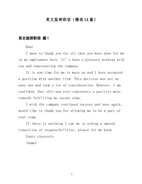 英文版辞职信(精选14篇)英文版辞职信篇1DearIwanttothankyouforallthatyouhavedoneformeinmyemploymenthere.It’sbeenapleasureworkingwithyouandrepresentingthecompany.ItisnowtimeformetomoveonandIhaveacceptedapositionwithanotherfirm.Thisdecisionwasnotaneasyoneandtookalotofconsideration.However,Iamconfidentthatthisnewrolerepresentsapositivemovetowardsfulfillingmycareeraims.Iwishthecompanycontinuedsuccessandonceagain,wouldliketothankyouforallowingmetobeapartofyourteam.IfthereisanythingIcandoinaidingasmoothtransitionofresponsibilities,pleaseletmeknow.Yourssincerely(name)1英文版辞职信篇2hi,dearall,astimegoesby,finallythedayformyleavingfcbgaiscoming,iwilltransfertocpuiegroupfromww49.nowit'sreallyahardtimeformetosaygoodbyetoyouall.lookingbacktopast1year,thosehappiness,sadness,greatteamworkdoimpressmealot,fromyouihavelearnedalot...