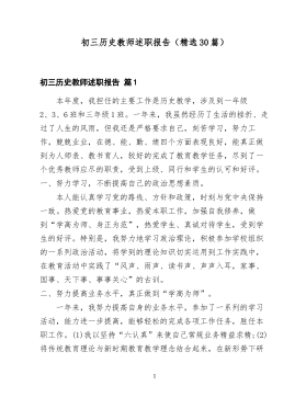 初一历史教师述职报告(通用29篇)初一历史教师述职报告篇1时间飞逝,一个学年转瞬即逝。在这一学年中,我承担七年级(1、2)两个班的历史教学任务,由于自己能够做到尽职尽则、为人师表、教书育人,所以圆满完成了学校分配的各项任务,得到了同事的肯定。为了能在新的一年里再接再励,使教学质量更上一层楼,现将20xx——20xx学年的教学工作回顾如下:(一)德育方面本人热爱中国共产党,忠诚党的教育事业,在思想上积极进步,爱岗敬业,为人师表,遵守学校的各项规章制度,积极参加学校的各类学习,并且认真记录,及时反馈,努力提高自己的思想觉悟,不断地完善自我。我不善言谈却踏实肯干,了解我的老师对我的评价大都是两个字:塌实。我相信再笨拙的行动都能使一切华美的语言黯然失色,只有求真务实才能真正有所收获。我的真诚换来的是老师们的信任与照顾,在学校里与大家和睦相处,团结协作,做到大事讲原则,小事讲风格,服从安排,以大局为重,以学校利益为重,不计较个人得失,较好地处理了个人利益与集体利益的关系,多说有利于学校发展的话,多做有利于学校发展的事,尽心尽职做好自己的本职工作。在工作中我积极、主动、勤恳、责任心强,服从学校领导的工作调配,乐于接受学校布置的各项工作;任劳任怨,对待学校分配的工作,在思想1上不敢有半点懈怠,总是积极认真地去完成,向优秀的同事看齐,用更高的标准要求自己。(二)出勤方面这一学年里,我担任七年级的历史教学工作,每天都坚持提前进教室辅导学生,从不间断,坚持做到不迟到,不早退;无论自己有多大的事,都是小事,总是把工作放在第一位,坚持大事少请假,小事不请假。真正做到爱生如子,以校为家。(三)教学能力方面在教学中,我总是刻苦钻研,大胆创新,时刻走在课改的最前沿,努力用最先进的思想,采用最新颖的方法去引导学生;我从不打“无备之仗”,无论是新课还是复习课,每天晚上,无论多忙多累,我都习惯于将当天的教学内...