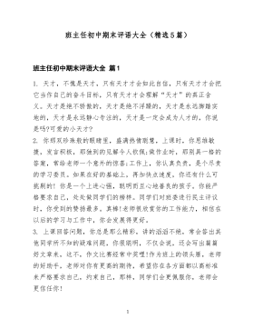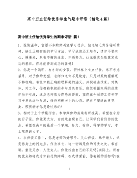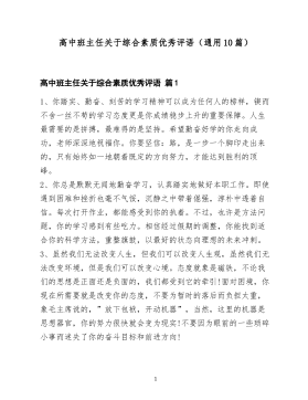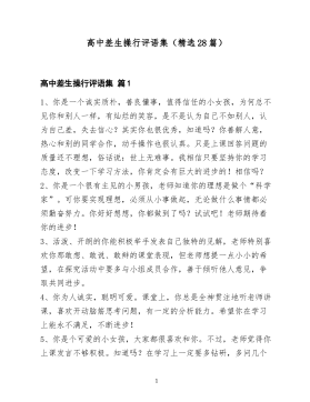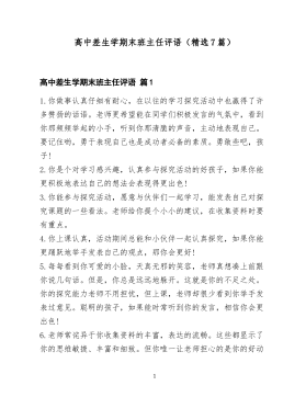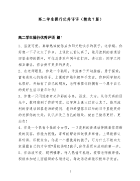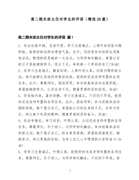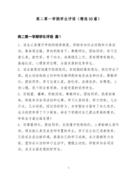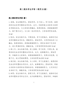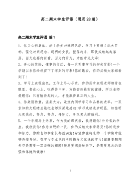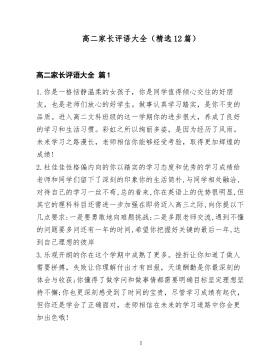 高二家长评语大全(精选12篇)高二家长评语大全篇11.你是一格恬静温柔的女孩子,你是同学值得倾心交往的好朋友,也是老师们放心的好学生。做事认真学习踏实,是你不变的品质。进入高二文科班级的这一学期你的进步很大,养成了良好的学习和生活习惯。彩虹之所以绚丽多姿,是因为经历了风雨。未来学习之路漫长,老师相信你能够经受考验,取得更加辉煌的成绩!2.杜佳佳性格偏内向的你以踏实的学习态度和优秀的学习成绩给老师和同学们留下了深刻的印象你的生活简朴,与同学相处融洽,对待自己的学习一丝不苟,总的看来,你在英语上的优势很明显,但其它的理科科目还需进一步加强在即将迈入高三之际,向你提以下几点要求:一是要勇敢地向难题挑战;二是多跟老师交流,遇到不懂的问题要多问还有一年的时间,希望你把握好关键的最后一年,达到自己理想的彼岸3.乐观开朗的你在这个学期中成熟了更多。挫折让你知道了做人需要拼搏,失败让你理解付出才有回报,天道酬勤是你最深刻的体会与收获;你懂得了做学问和做事情都需要明确目标坚定理想坚持不懈;你也更深刻感受到了时间的宝贵,尽管学习成绩有起伏,但你还是学会了正确面对,老师相信在未来的学习道路中你会更加出色哦!14.虞佳莉默默无闻,却始终坚韧地向前。“书山有路勤为径,学海无涯苦作舟。”学业上你很刻苦,也心地善良,文静可爱,又有不肯认输的脾气。凭着一份执着和热情,你能把精力极大地投入到学习中来,并一如既往地努力。这很值得其他同学学习。临近期末出现心态上的微小波动也正常,毕竟当初你选择二类还是美术也很盲目。你也即将成为高三毕业班学生了,老师向你提出以下几点要求:一是珍惜好以后的每次复习机会,扎扎实实打好学习的基础;二是永远保持乐观向上的态度,积极面对困难。期待明年六月你考出理想成绩。5.老师眼中,你是个文静勤奋的孩子;同学们眼中,你是个善良朴实的学生。你在课堂中并不主动表现自己,但老师知道你是一个很有思...