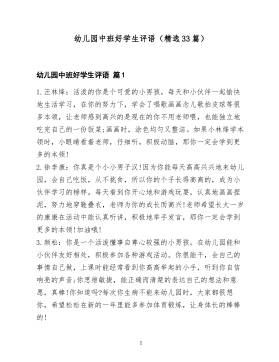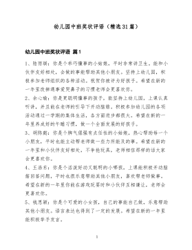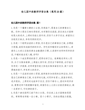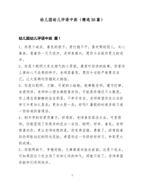 幼儿园中班教师评语合集(通用20篇)幼儿园中班教师评语合集篇11.你是一个懂事文静的小女孩,你很能干,愿意自己的事情自己做。你和小朋友们相处得较好,本学期你在画画,语言表达方面都有很大的进步,上课时你能认真听讲,但你不大举手发言,希望你以后能改正缺点,争取有新的进步。2.你是一个聪明活泼的小男孩,你乐意自己的事情自己做,自理能力很强,能较快地接受新的知识。但吃饭和睡觉时会妨碍别人,希望你上大班以后能改掉自由散漫的习惯,认真倾听老师和同伴的讲话,午睡时能自觉入睡,好吗?3.你是一个诚实厚道的孩子,爱劳动讲卫生。能尊敬老师关心同伴,乐于为集体做事,上课能认真听讲,但发言不够积极,动手能力有待进一步提高,老师希望你能大胆地在集体面前发言,做个自信勇敢的孩子,争取更大的进步。4.你是一个活泼好动的小男孩,能积极参加班级的各种活动,你乐意自己的事情自己做,对老师有礼貌,对同伴有爱心,画画非常好,进步很快。上课有时也能举手发言,但你不够专心,喜欢和同伴讲话,需要老师不断提醒和督促,希望你在上大班以后能改掉缺点,做一名爱学习,守纪律的孩子。5.你是个善良聪明又能干的小女孩。你在班上各方面都表现很好,常常帮老师做一些小事,是个小帮手。你的自理能力很强,1你上课认真,爱动脑筋,能积极举手发言。你喜欢帮助别人,小组长工作认真负责。老师希望佳钰以后做事能仔细一些,平时有时间多看看图书,多认识一些字,做得更棒,好吗?加油!6.你是一个好学上进的小男孩,你乐意自己的事情自己做,在幼儿园有良好的午睡习惯,在绘画举手发言等很多方面都比原来有进步。你对老师有礼貌,与同伴友好相处,你上课时能认真听讲,游戏活动中遵守规则,做事特别细心,希望你以后更大胆些,加强语言表达能力,好吗?7.砚语,见到你第一眼,老师就被你那双黑亮的大眼睛吸引住了,因为那里盛满顽皮热情可爱。你是一个多才多艺的小姑娘,绘画唱歌做手工等都是...