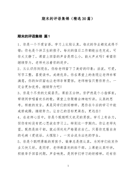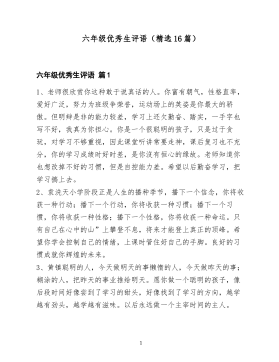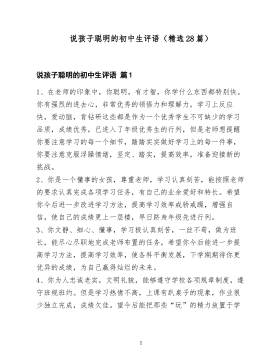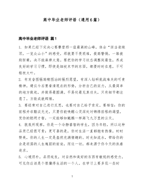 高一年级学生评语(精选33篇)高一年级学生评语篇11、你是一个可爱的小女孩,有时候活泼好动,像只小兔,有时候又懒洋洋的,你尊敬老师,也能在课间和小朋友一起做有意义的活动,待人热情有礼,喜欢帮助同学,拾金不昧,上课比较认真,书写认真时特别漂亮,老师希望你以后在学习上多下一点功夫,做事情要认真,要有始有终,生活上能够自己照顾自己,不挑食,健康快乐地成长!2、懂事听话的你,在学校里,你专心听讲,积极思考,认真完成作业。课后,你自觉遵守纪律,认真学习,成绩较好。希望你继续努力,争取更好的成绩。3、遇见老师,你能主动问好,和同学你能和睦相处。课堂上,有时你也能专心听讲,积极举手回答问题,按时完成作业。老师希望你能坚持听好每一节课,争做一名优秀的学生。4、你是个聪明可爱的孩子,热爱学习,工作责任心强,自觉遵守纪律,积极主动参与学,勤学好问学习成绩拔尖。老师很喜欢你,愿你戒骄戒躁争取更好的成绩。5、你听说过这样一句话吗?“天下无难事,只怕有心人”相信只要你也向班上其他同学一样勤奋学习,你的成绩一定会进步的,你有信心做到吗?老师期待着你的进步。16、老师真为你高兴,因为这个学期里,你懂事了许多。比以前守纪律了,爱学习了,老师渴望看见你端端正正坐在教室里自觉学习的身影啊,你能做到吗?7、你是一个文静、善良的女孩。你积极参加公益劳动,乐于帮助有困难的同学,有奉献精神,上课能认真听讲,作业令老师满意,希你考试时细心、多检查,避免不必要的失误,争取得到令人满意的成绩。8、你是一个文静又懂事的女孩。你在班中默默无闻,从不与同学学争执,为人忠诚,性格俭朴,能礼貌待人。学习上有自觉性。希上课要积极动脑,举手发言,课后要花工夫,把学到的知识巩固牢,扬长避短,相信你会更出色。9、你是一个勤劳,善良的孩子,老师很喜欢你。只要你能找到适合于自己的学习方法,相信你会进步的。老师希望你加油,赶上来。10、你是一个捉...