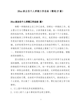 八年级班主任下学期工作总结报告(精选34篇)八年级班主任下学期工作总结报告篇1忙碌而又充实的第二学期即将告一段落,回首这短短的几个多月,从春寒料峭到暑气逼人,似乎弹指一挥间,但翻看班主任工作手册上的班主任会议记录,才发现,密密麻麻大大小小,我和同学们一起做了很多事情。它们都记录着走过的岁月,记录着我们的辛勤的汗水,劳作的智慧。真的有必要总结一下,梳理一番。一、本学期完成的主要工作:1、积极配合学校、年级、各科室做好教学督导迎检工作。2、加强对学生的思想教育,培养学生良好的道德品质,努力培养合格人才。为了配合学校团总支和政教处的工作,我们班积极开展了许多有益于学生身心健康发展的活动。上好每一节主题班会,利用班会课对学生进行身心教育,帮助学生澄清思想上的模糊认识,提高学生的思想境界。我还充分利用课余时间和有关学生促膝谈心,及时对学生进行针对性的教育。3、加强班级管理,培养优良的学风、班风。八年级是学生的世界观发展、变化的重要阶段,随着课时和知识复杂程度的加重,很容易产生两极分化,有的学生甚至会感到迷惘,对前途失去信心。在这个学期里,一方面,我主要加大了对学生自治自理能力培养的力度,通过各种方式,既注意指导学生进行自1我教育,让学生在自我意识的基础上产生进取心,逐渐形成良好的思想行为品质;又注意指导学生如何进行自我管理,培养他们多方面的能力。4、积极抓好后进生的转化工作。后进生的教育和管理历来是班主任工作的难点,却又是影响班级整体教育教学质量提高的至关重要的一环。在这方面,我作为班主任及时对后进生加强心理疏导,帮助他们消除或减轻种种心理担忧,让他们认识到自己的价值。同时,我还创造条件和机会让后进生表现其优点和长处,使他们品尝到成功的欢乐和喜悦。5、做好和家长联系的工作。每一次月考之后,我及时和学生家长联系,让家长及时了解了学校和学生的情况。同时班主任也了解了学生在家的情况、学生的...