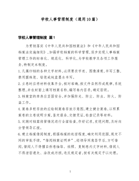 学校人事管理制度(通用10篇)学校人事管理制度篇1为贯彻落实《中华人民共和国档案法》和《中华人民共和国档案法实施细则》,加强学校档案的科学管理,逐步实现人事档案管理工作的标准化、规范化、科学化,为学校教学及各项工作服务,特制定本制度。1.凡属归档的各种文字材料,必须要求字迹、图像清楚,书写工整,禁用圆珠笔、铅笔或纯蓝墨水书写。2.立卷时应将材料收集齐全,核对准确,按文件自然形成规律,系统整理,并在封面上填写档案名称,编写卷内目录,确定密级。3.档案室的库房应坚固安全,并加强防光、防尘、防虫、防火、防盗工作。4.案卷多柜存放的应绘制案卷存放示意图,建立健全案卷,以积累案卷的立卷说明方案,鉴定报告,交接凭证,检查记录等材料。5.定期对档案保管情况进行全面检查,作好记录,发现问题,及时向分管领导汇报。6.建立档案借阅制度,根据档案的机密程度,确定利用范围,规定不同的审批手续,“借阅档案证明单”,经领导同意签字后,方可借阅,借阅人不得擅自拆卷抽取、拍照、复制卷内文字材料,借阅人不得泄密遗失、涂改或污损,违反规定者,按有关规定予以处理。17.档案的鉴定工作在校长的领导下,由档案鉴定小组定期实施鉴定工作,确定保管期限和密级,编制销毁清册。8.鉴定工作结束后,鉴定小组应写出“档案鉴定工作报告”。9.在学校形成的各类永久性档案,保管二十年后,连同“案卷目录”(一式三份)和有关检索工具一并向上级档案部门移交。学校人事管理制度篇2一、总则第一条为规范学校人事管理,提高人事管理效率,特制定本管理制度。第二条学校人事管理遵循平等公正、宽严协调、奖惩并举的原则。第三条学校职工在严格遵守本规定的基础上,应当认真、负责、创新性地工作,给学校积极献言献策,推动学校的长远发展。二、职工权利与义务第四条学校职工享有以下权利:1、在制度范围内自主开展本职工作,进行相关领域的改革、研究和实验;2、按时获取工作报酬...