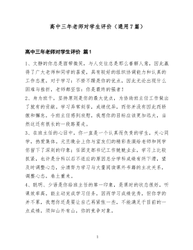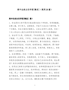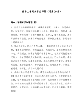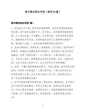 高中生期末评语(精选31篇)高中生期末评语篇11、三分天注定,七分靠打拼,沉下一颗心,以不变应万变。2、用拼搏的汗水灌注无悔的高三路。考前不怕,考后不悔。3、只有一个忠告给你——做你自己的主人。拼搏无极限。相信:机会是创造来的,不是等来的。4、古往今来,大凡出名的人哪一个不是跟“勤”字有关,大科学家爱因斯坦也曾说过,天才出于百分之九十九的汗水加百分之一的天赋,可见,成功的喜悦是辛勤的汗水浇灌出的,而懒惰的人大多一事无成。你身上最大的毛病是什么——“懒”。“懒”使你迷失了学习的方向;“懒”使你染上了许多坏习气;“懒”使你丧气了斗志;“懒”使你与成功无缘。其实,你是很聪明的孩子。你模仿力较强,记得那次班队会上,你表演得“孙悟空”,惟妙惟肖多令人记忆犹新。孩子,树立起必胜的信心,去打败你的“天敌”吧!到时,会有“奇迹”出现的。5、每当看到你那着扫帚在教室里忙碌的身影我总是看在眼里,喜在心里,多好的学生!,你的学习基础是差了一些,但你不要有太多压力,不必提心吊胆,也不要灰心,“世上无难事,只怕有心人”,只要你学习专心些勤奋些细心些,不懂就问。你的成1绩会赶上来的。自信些,老师家长同学都在关心你支持你!等你的好消息噢!6、你其实很聪明,这学期,老师很高兴看到你不再那么贪吃,校门口的小摊前没有你的身影了。如果你上课能专心听讲独立完成作业有错及时改正,相信你会进步的。老师期待着你的进步。7、虽然这学期你的某些行为受到了老师的批评,但你能正确对待,并且积极改正,这也是难能可贵的,希望你能在学习上多与老师和同学沟通,增强自信心和主动性,尽最大的努力去弥补自己的不足。8、你是一个很有上进心的孩子,关心集体,乐于助人,热爱劳动,学习态度端正,课堂上举手很积极,作业也认认真真,学习成绩优秀。你很讲究个人卫生。希望你继续保持好的学习态度,在书写方面再下功夫,争取更大的进步!同时不满足课内知识的学习。...