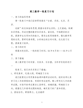 高三数学一轮复习计划一、复习的指导思想第一轮复习中我们坚持贯彻落实“全面、系统、扎实、灵活、创新”的总体指导思想,根据本校学生实际,立足基础,构建知识网络,形成完整的数学知识体系,面向低、中档题目抓训练,提高学生运用知识的能力,要突出抓思维教学,强化数学思想的运用,要研究高考题,分析相应的应考对策,优化复习过程,提高复习效率。二、复习的时间根据本校实际,一轮的复习时间:XX年9月初——XX年2月初三、复习措施高三数学复习时间紧、内容多、任务重,为科学有效的进行一轮复习,我们决定采取以下措施:1、研究高考、吃透大纲,明确复习方向我们组要充分利用集体备课和教研活动时间,组织老师认真学习近三年的课程...