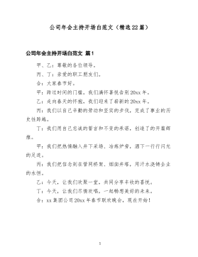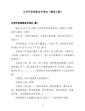 公司平安夜晚会开场白(精选4篇)公司平安夜晚会开场白篇120xx年12月14日晚5:18时优秀部全体家人(嘉宾)入场阿波罗大酒店久福厅话外音:大朋友请坐好,小朋友不要乱跑,我们的节目马上开始了!中央电视台,中央人民广播电台、平安之声,现在是北京时间20xx年12月14日下午17:58分圣诞老人和圣诞小精灵上场(音乐:铃儿响叮当)小精灵开心的说:圣诞爷爷,一年没见了,老少爷们更精神了!大姐姑娘们更漂亮了!圣诞老人说:哈--哈---哈--是啊,男的更英俊潇洒了!女的更美丽大方了,嗨~我看大家今天都很有福气呀~来来来,我给大家发红包了。。。。。。(圣诞老人边说边抛糖果及小礼品还有红包)小精灵:爷爷!我要给大家贺新年!圣诞老人说:好啊!小精灵:祝大家-----新年就来到、鼓起你腰包、事业定有成、爱情甜如蜜,家庭很美满、好运常相伴。吉祥和如意、幸福加平安、永远围绕在你的身旁。。。。。圣诞的钟声已经敲响,我们又迎来了一个祥和的平安夜;1喜悦的心情就要释放,我们又盼来了一个欢庆的圣诞节;伴着动人的旋律,我们尽情地欢呼歌唱。带着新春的祝福,我们虔诚地祈祷未来。尊敬的各位来宾,亲爱的各位朋友,大家晚上好!我是陈先财,我是郑婷。今夜,我们欢聚一堂、载歌载舞;今夜,我们激情满怀、心潮澎湃;听,金钟朗朗,这是平安动人的旋律。看,灯火辉煌,那是圣诞绚丽的色彩,。光阴似箭,斗转星移,收获满满的20xx即将过去;岁月匆匆,抬头展望,挑战梦想的20xx已经来临。在这个欢快的时刻,我们分享喜悦,放飞梦想。在这个狂欢的日子,我们充满激情,豪情万丈;20xx年平安优秀部“结缘平安畅响未来”平安夜晚会现在开始!今天的节目经过我们优秀同仁精心的准备,可谓精彩粉呈,肯定会让您耳目一新。我们在欣赏节目的同时,还为大家安排了激动人心的幸运大抽奖,奖品多多,惊喜多多!大海航行靠舵手,万物生长靠太阳,接下来我们用最最热烈的掌...